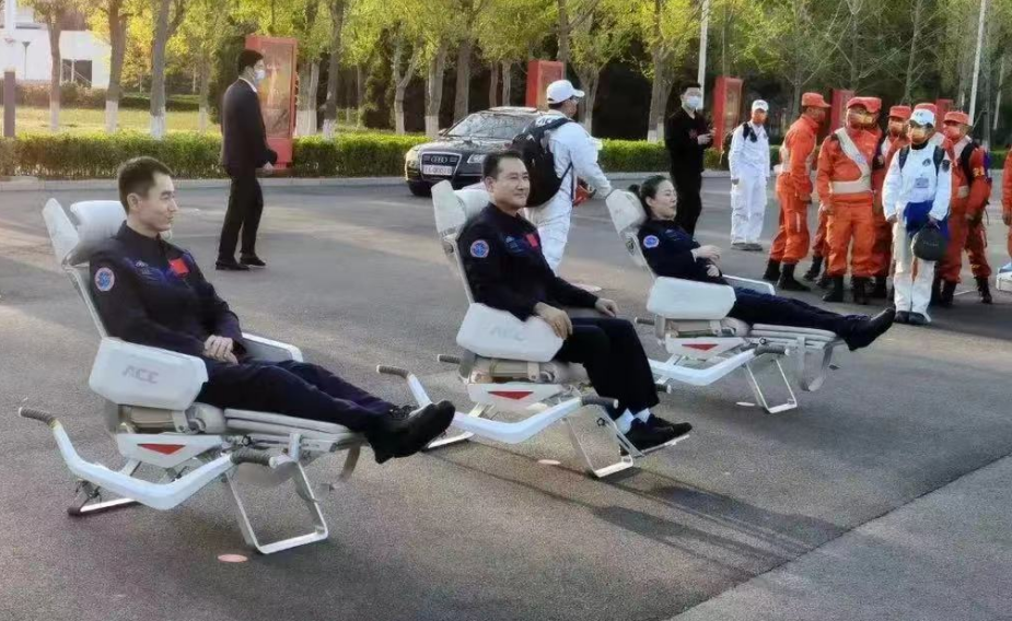 而在神舟十三、神舟十四的航天員落地出艙現場(chǎng),我們看到航天員被醫護人員從艙中抬出來(lái)后,直接被安置在一張白色躺椅子上,這個(gè)張椅子就是專(zhuān)為航天員定制的“減重力”護航椅。